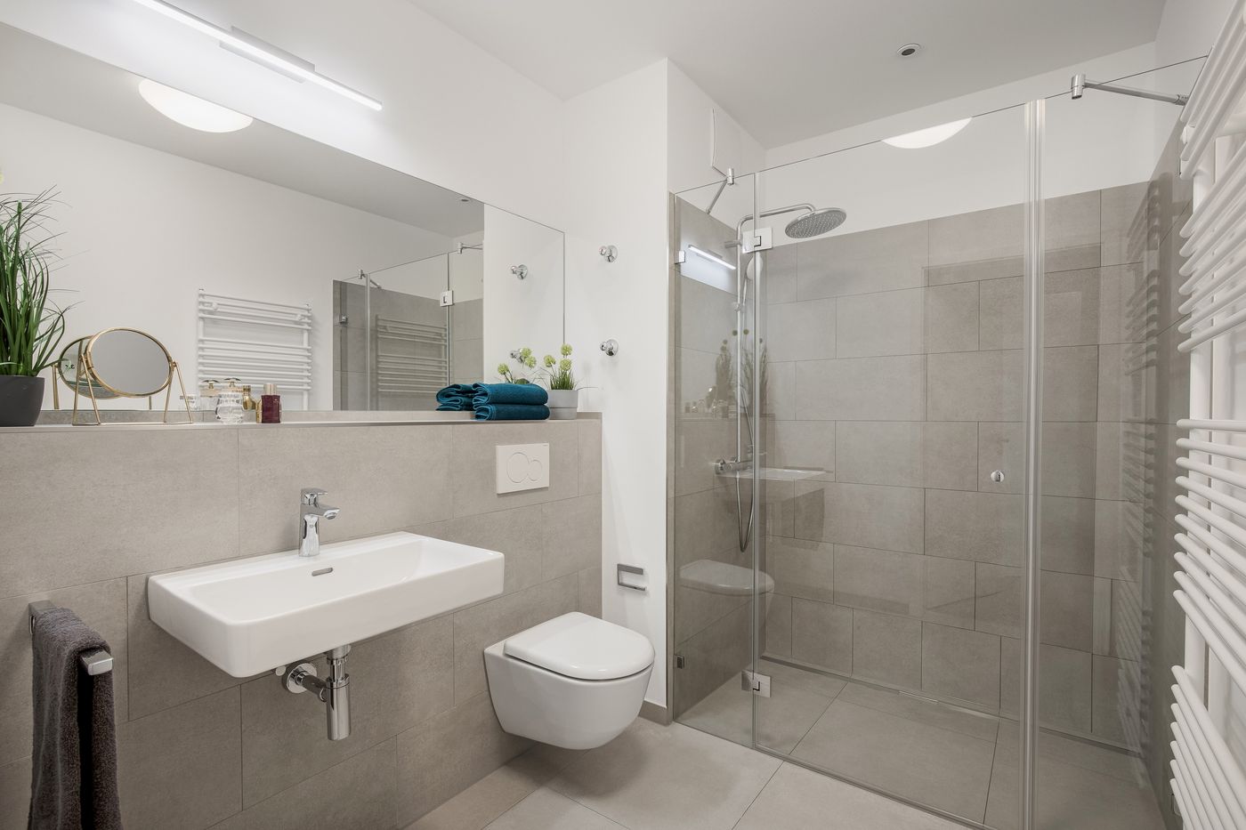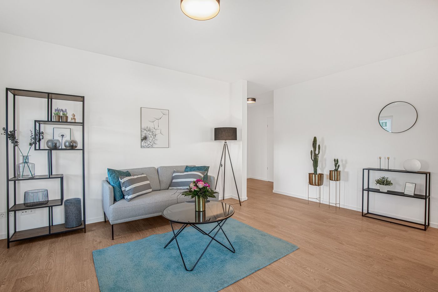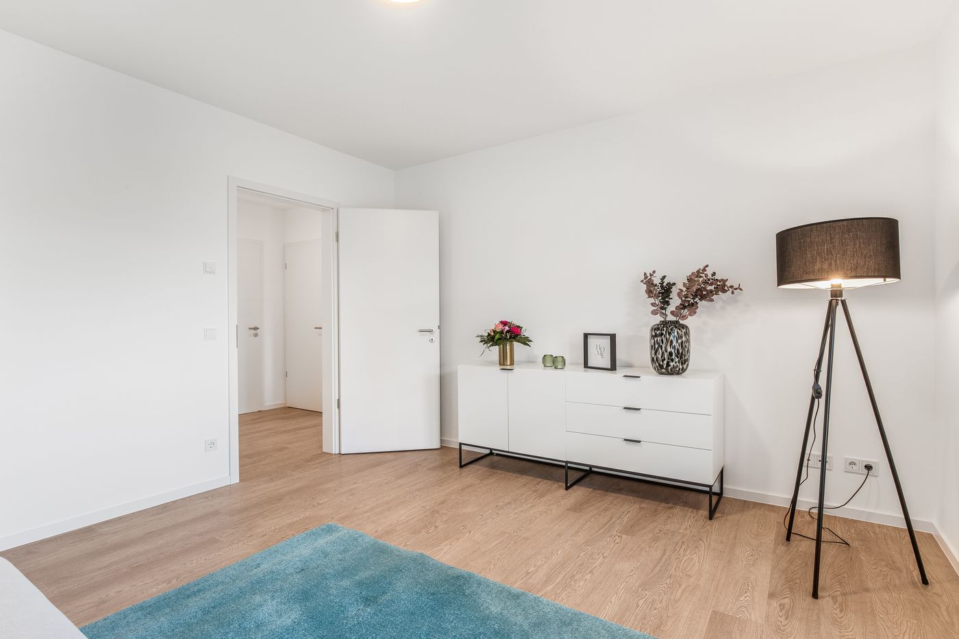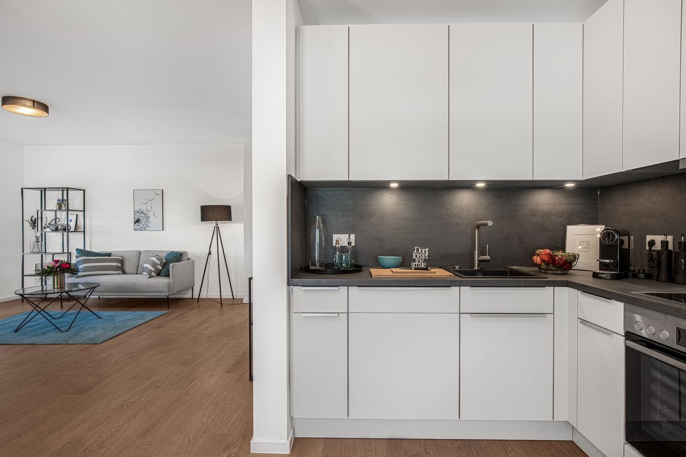 Bilder der Musterwohnung in der Nina-Zober-Straße 3 (Haus 2). Die Möblierung ist ein Gestaltungsvorschlag und gehört nicht zum Ausstattungsumfang.